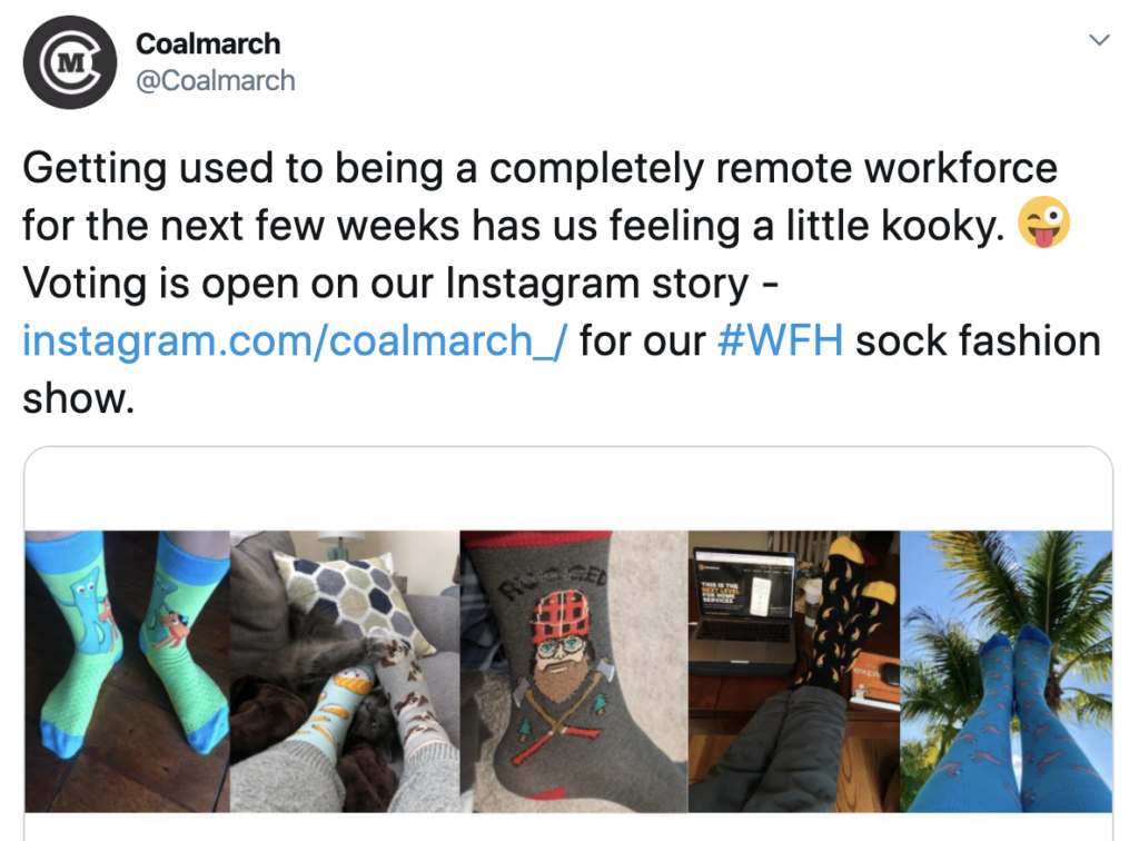 • Stay positive. In this stressful time, Coalmarch has remained positive, and their messaging consistently reflects this. They’ve even integrated some fun along the way by doing things like sharing photos of pets from the home office on Twitter, hosting a remote sock fashion show, and even playing Office Bingo and MadLibs with their remote employees.