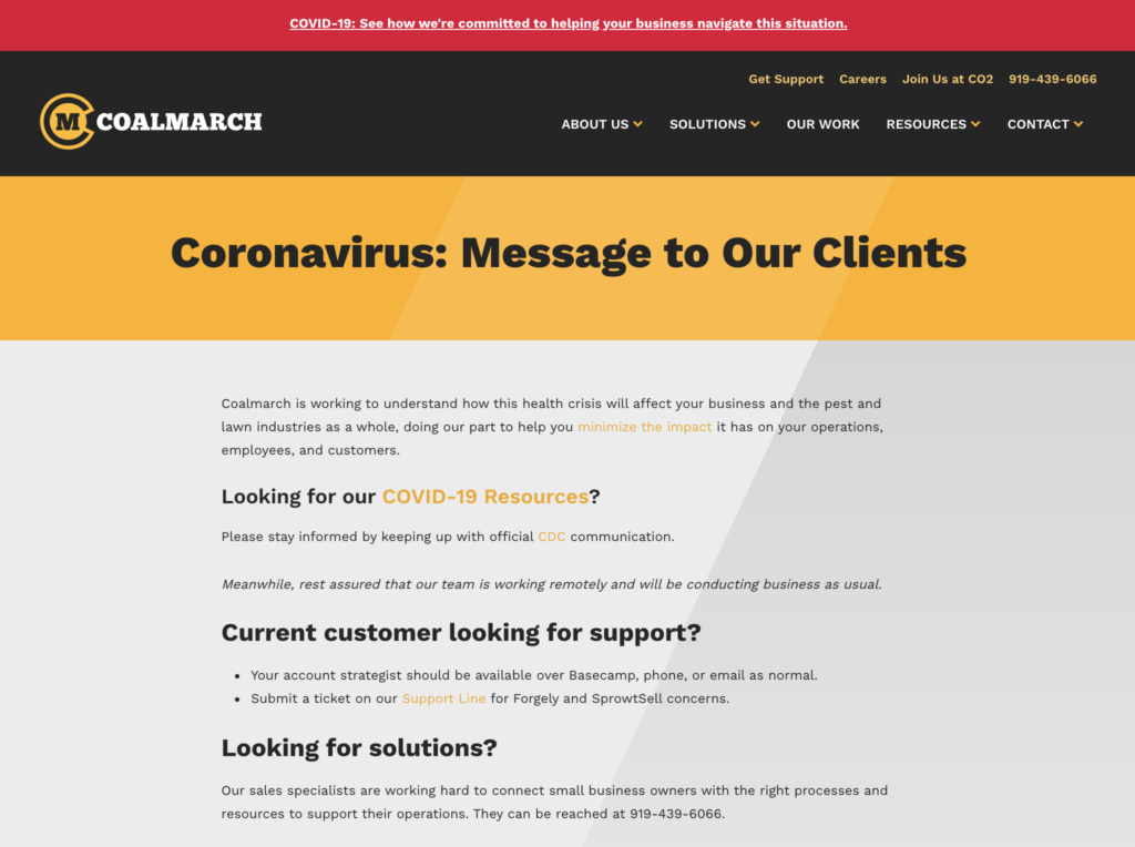 Within the first few days of the pandemic, Coalmarch knew they needed to quickly respond with ways to assist their industry, clients, and employees. They realized in order to do this successfully, it was critical to create a centralized hub to communicate how they were personally handling COVID-19 as a partner, and as an organization. Luckily, their dedicated team was able to quickly implement this hub, and now it serves to ensure consistent messaging, as well as a place to post frequent updates. It also provides resources and suggestions to help stakeholders manage their own staff, marketing, sales, and financials during the pandemic.